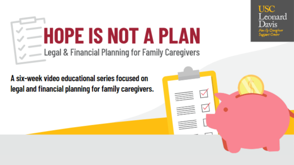 Los Angeles Caregiver Resource Center hosted a 6-week series called “Hope is Not a Plan: Legal & Financial Planning for Family Caregivers”. In this series, experts and professionals who have worked in their field for many years discuss how legal and financial planning issues can affect caregiving families. Topics covered include: